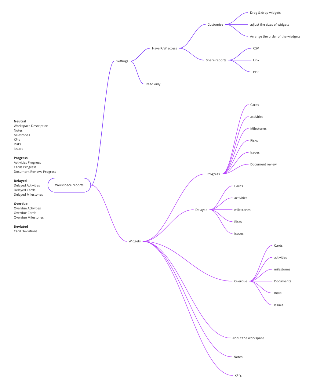 We have categorized all the widgets into 5 parts(Neutral, Progress, Overdue, Delayed and Deviated) as seen in the below mind map.