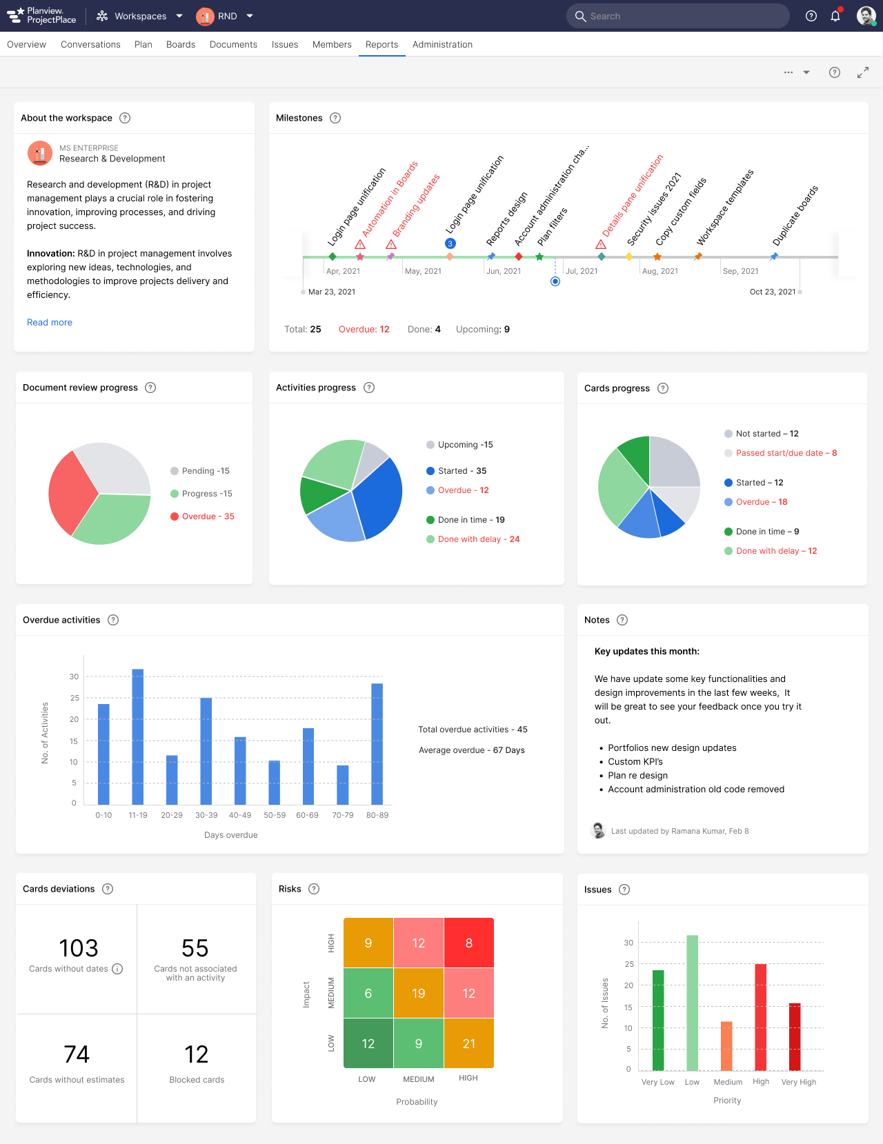 The reports dashboard provides an overview of project progress, focusing on key artefacts within ProjectPace: Documents, Cards, Activities, and Milestones. After extensive workshops and stakeholder discussions, the following categories and widgets were identified: