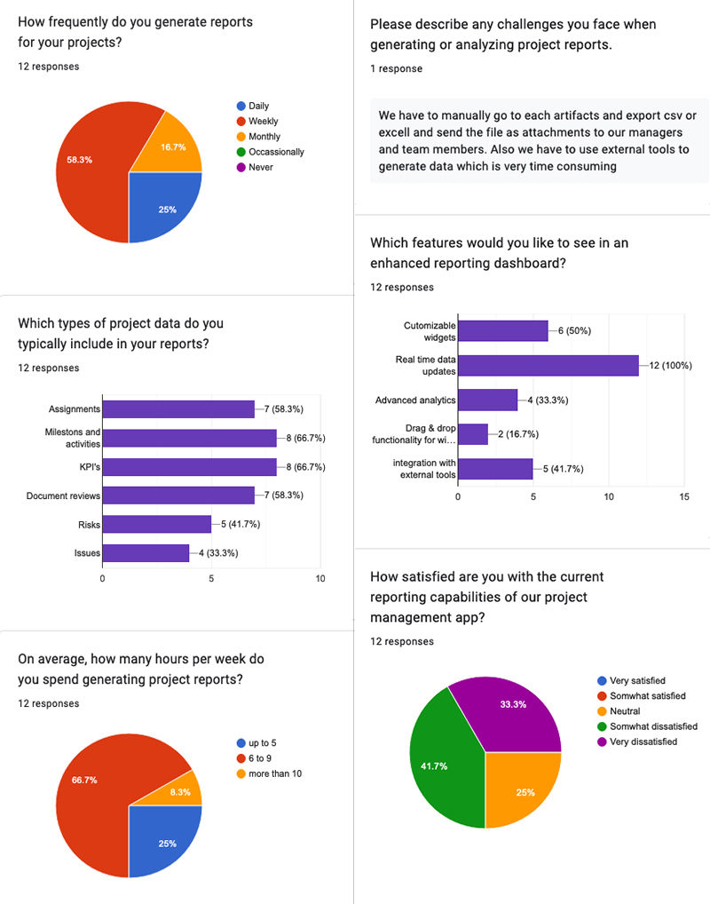 - Over 70% of surveyed users reported frustration with the lack of in-app reporting capabilities, citing the need to rely on external tools or manual processes. Common pain points include difficulty in accessing relevant project data, generating comprehensive reports, and sharing insights with team members.