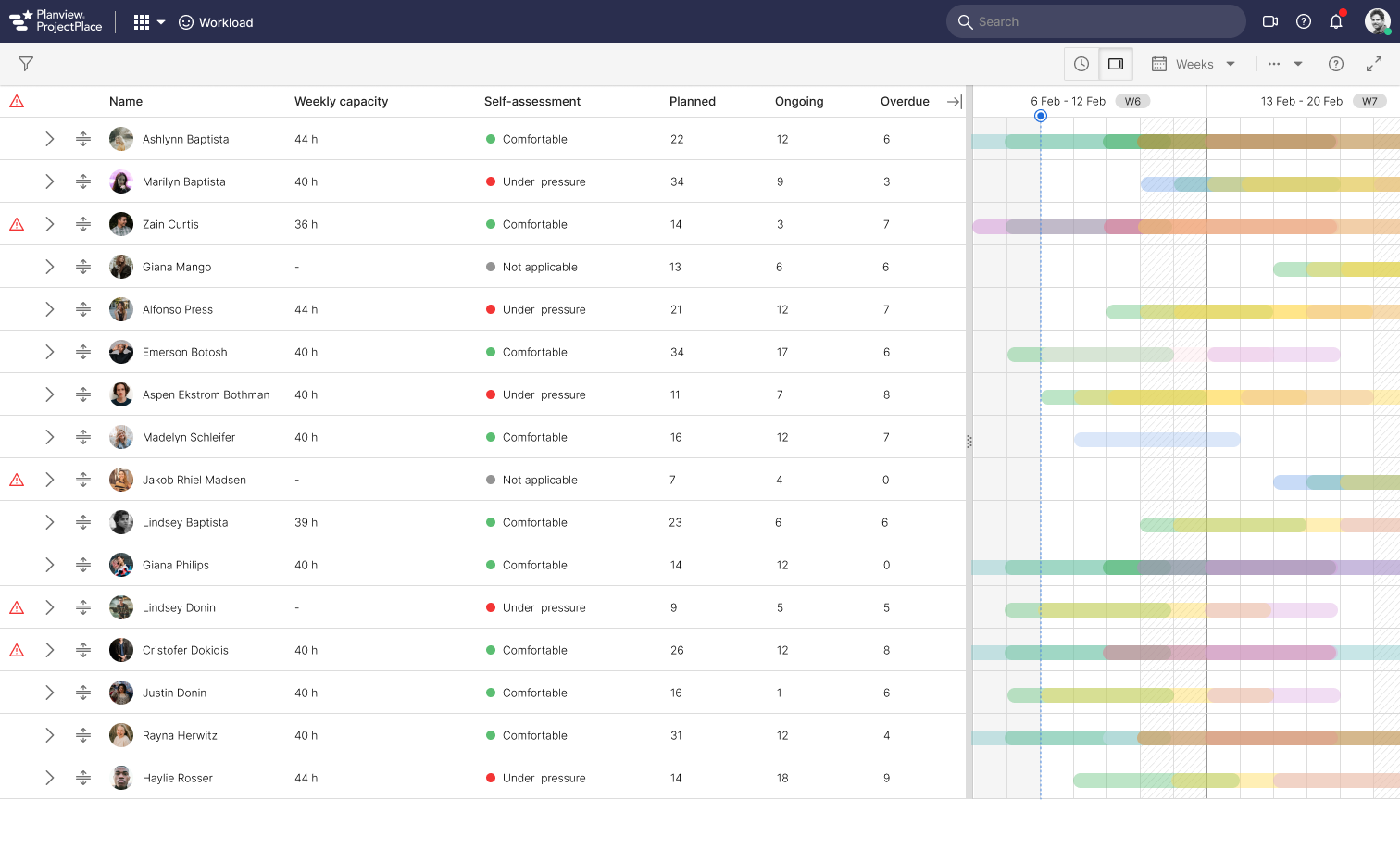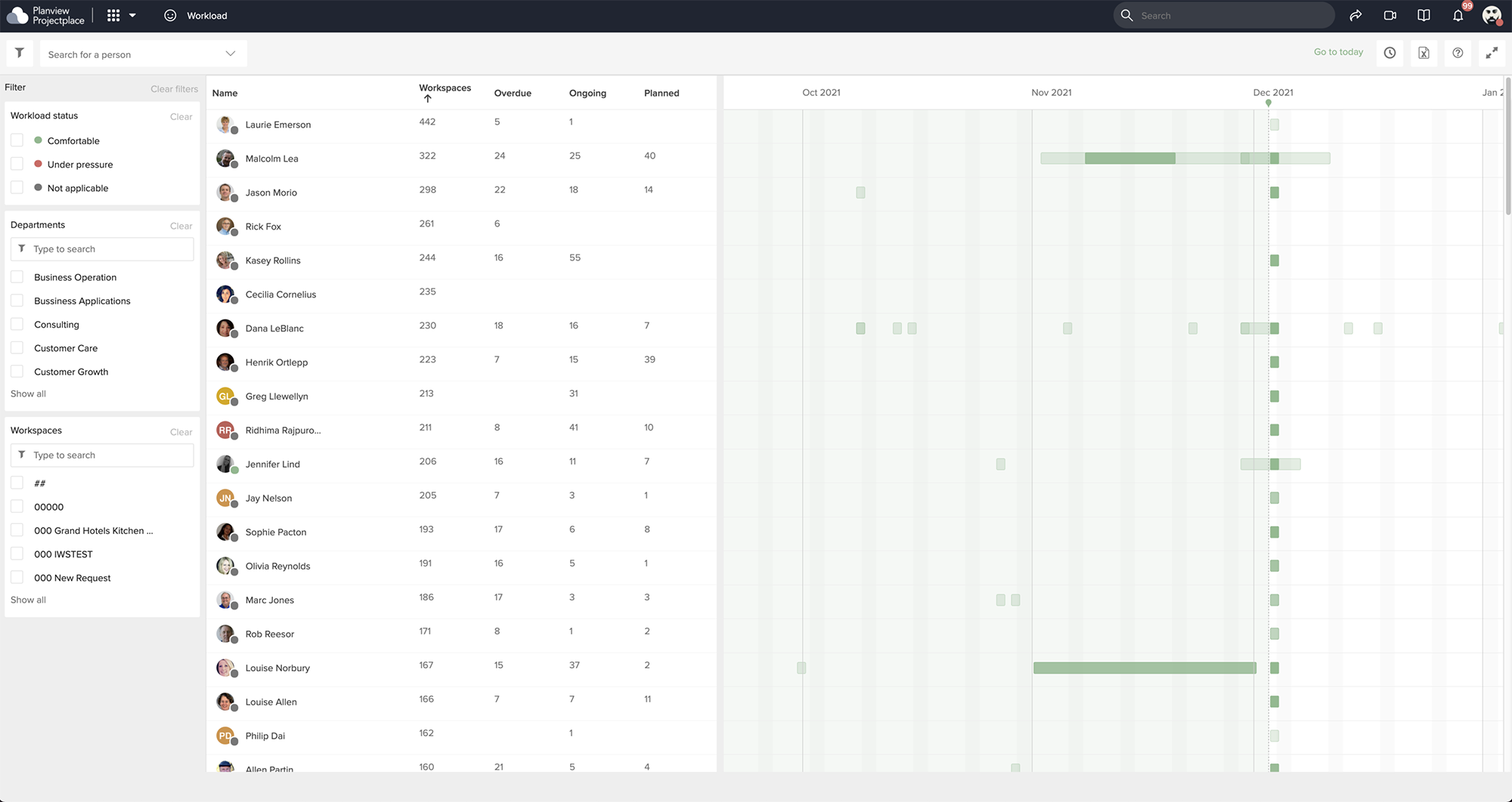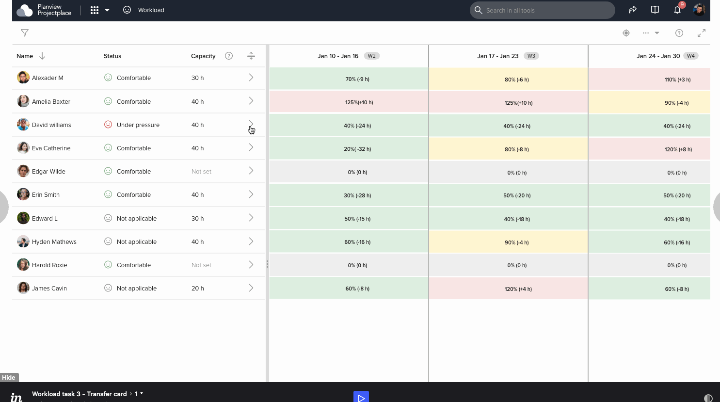 The Workload tool in Planview (Projectplace) shows how much work each team member has in all account workspaces. It helps workspace managers to see if someone has too much work and feels overwhelmed or if they don't have enough work and are underutilized.