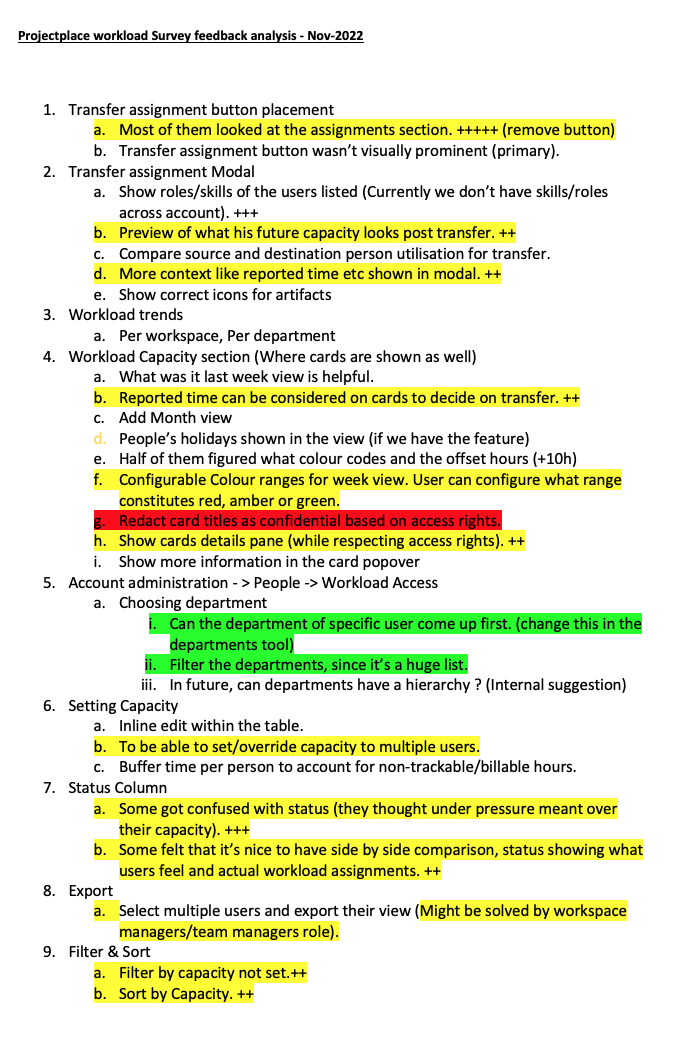 | Only heat map view is available. Customers can’t completely relay on this view. They wanted to see the number of tasks as well as the time spent on their assigned tasks against their capacity per week. | Introduce capacity view and clearly communicate each member’s work vs capacity numbers, so that admins can easily manage their workload. |